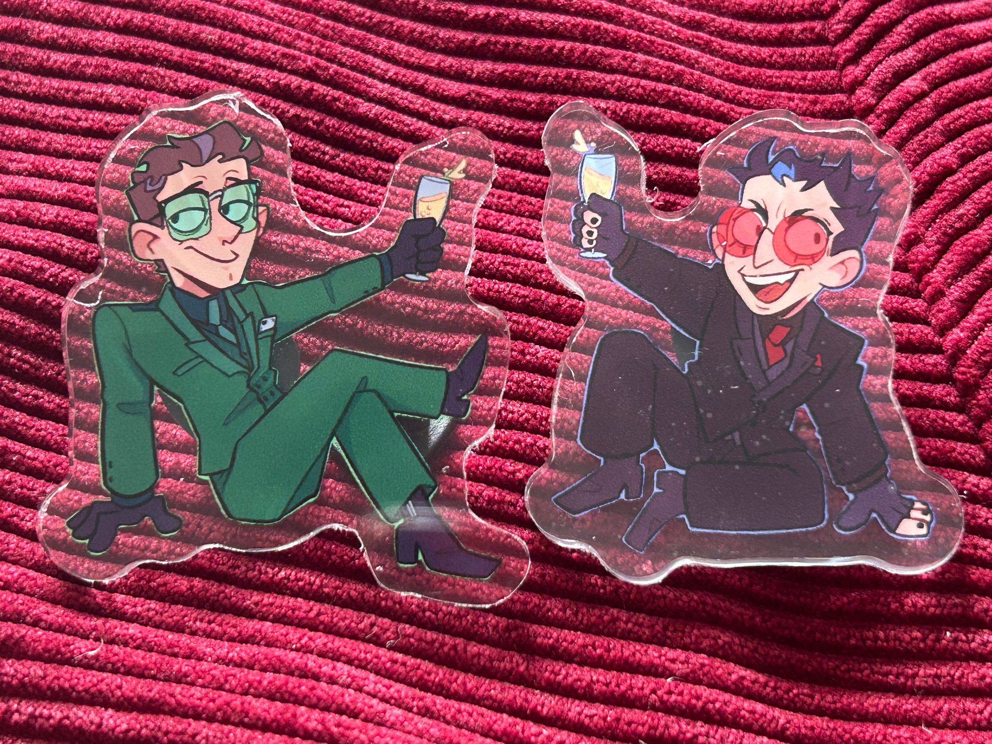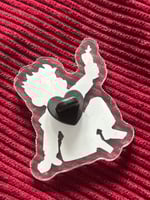 Approx. 2” acrylic pin with a black heart backing. Be sure to remove the plastic protective film before you pin them somewhere! Please consider the above dimensions and material before purchasing. Thank you!